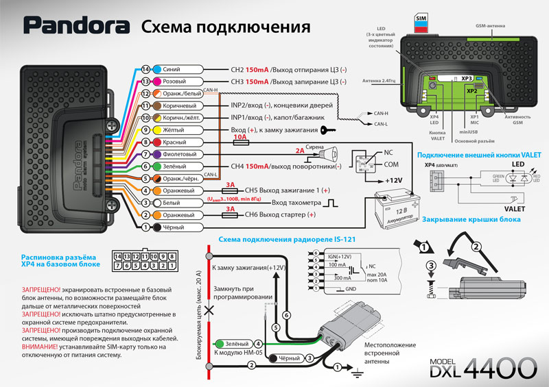 Автомобильная сигнализация Pandora DXL 4400 — это современная охранно-сервисная GSM система с 2-сторонней связью, предназначенная для надёжной охраны абсолютно любых автомобилей, оснащенных CAN-шинами. GSM-сигнализацией можно управлять прямо с мобильного телефона: просто набрав номер системы, вы сможете включить или отключить режим охраны, запросить информацию о состоянии охранной системы и даже запустить или заблокировать двигатель. Сигнализация с автозапуском способна также автоматически запускать двигатель автомобиля по таймеру, по напряжению бортовой сети автомобиля или по температуре двигателя.