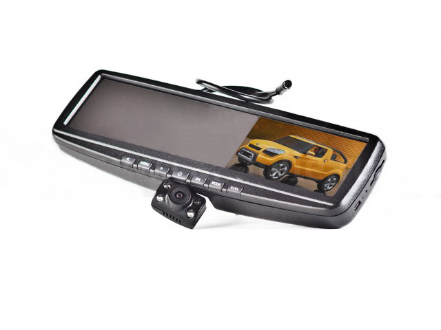 Зеркало заднего вида со встроенным  LCD монитором 4.3 дюйма и двухканальным видеорегистратором ERGOER430DVR – изобретение, которое позволит, наконец, разгрузить пространство на лобовом стекле, ведь камера видеорегистратора вмонтирована прямо в салонное зеркало Вашего автомобиля. Видеозапись производится одновременно с двух камер: внешней (с разрешением VGA 720х480) и встроенной (с разрешением HD 1280х720).