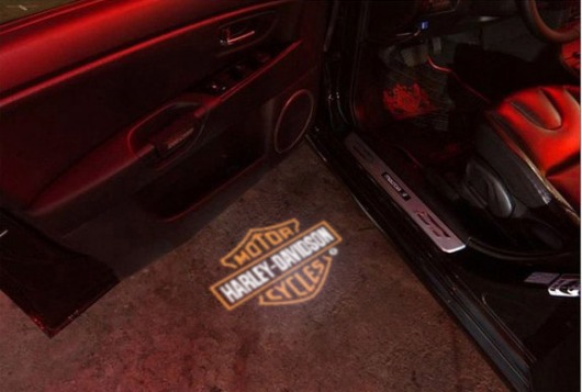 Подсветка с логотипом Harley Davidson — новый нестандартный вариант тюнинга! В дверь авто устанавливается миниатюрный проектор, который выводит на асфальт цветное изображение логотипа Харлей*. Картинка появляется, когда вы открываете дверь, и исчезает, когда дверь закрывается. Выглядит это очень стильно и необычно.