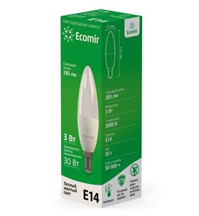 Светодиодная лампа Ecomir E14 3W эквивалентна лампе накаливания мощностью 30 Вт. Колба матовая, имеет форму пламени свечи. Потребляемая мощность – 3 Вт, цветовая температура – 3000 К (это желтый свет). Световой поток — 285 лм. Напряжение —220 В.
