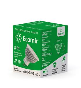 Светодиодная лампа Ecomir GU5.3 3W эквивалентна галогеновой лампе мощностью 25 Вт с цоколем MR16. Потребляемая мощность – всего 3 Вт, цветовая температура – 3000 К (это желтый свет). Световой поток — 260 лм. Напряжение — 220 В. Матовый рассеиватель. Угол освещения > 90°.
