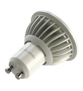 Светодиодная лампа Ecomir GU10 3W эквивалентна галогеновой лампе мощностью 35 Вт с цоколем MR16. Потребляемая мощность – всего 3 Вт, цветовая температура – 3000 К (это желтый свет). Световой поток — 260 лм. Напряжение — 220 В. Матовый рассеиватель. Угол освещения > 90°.