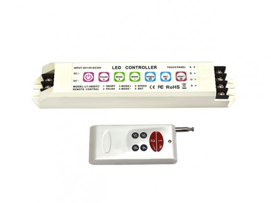 RGB-контроллер 3600 B с мощностью 180/360W позволит вам управлять свечением светодиодной ленты с помощью пульта ДУ по радио-каналу и прямо на корпусе контроллера. При этом дальность действия достигает 50 метров!