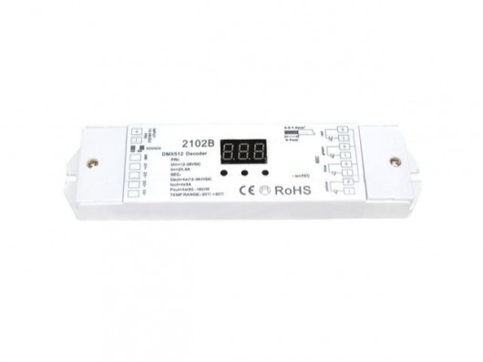DMX декодер 2102B с напряжением 12/36V и мощностью 240/720W позволит вам управлять свечением сразу 4 подключенных каналов, а также каждым из них по отдельности. Т.е. прямо с корпуса декодера вы можете управлять не только светодиодной лентой, но и прожектором и др.