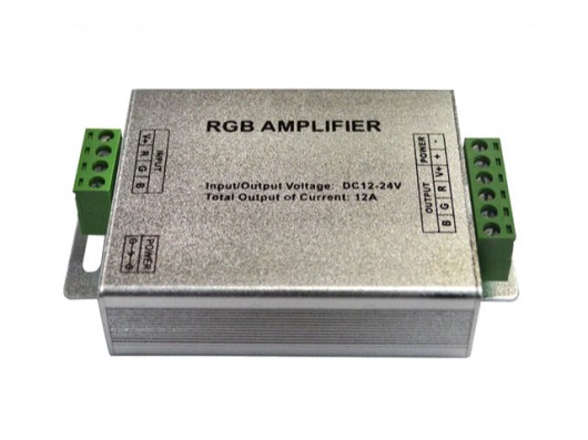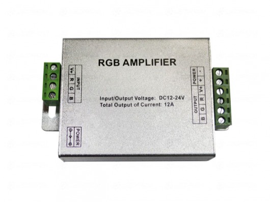 RGB усилитель LP-24A в металлическом корпусе позволит "разгрузить" RGB контроллер. Т.е. если мощность необходимого метража ленты превышает допустимую мощность контроллера, то к нему можно подключить усилитель. Таким образом, вы можете подсоединить до 20 метров дополнительной светодиодной ленты.
