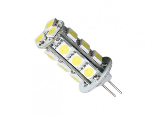 Светодиодная лампа G4/18-5050 с 18 светодиодами SMD 5050 и напряжением 10-30V — это отличная альтернатива галогенным лампам и лампам накаливания с цоколем G4. Яркость данной лампы составляет 12-15 Лм на 1 диод. А потребляемая мощность — всего 4,3 Вт! Цвет свечения лампы — холодный белый.