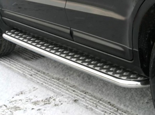 Боковые пороги-подножки сделаны специально для автомобилей Hyundai Santa Fe от 2013 г.в., поэтому устанавливаются достаточно просто и без повреждений корпуса. Помимо этого, стальные пороги с листом для Хендай Санта Фе смотрятся очень стильно и эффектно. Они добавят вашему авто еще больше солидности и внушительности.