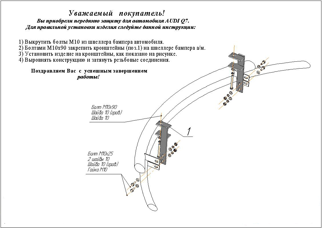 Защита переднего бампера труба предназначена для автомобилей Audi Q7. Вам не придется подгонять защиту под размеры бампера вашего авто. И с монтажом проблем не возникнет: установка защиты переднего бампера производится в штатные отверстия, а значит, необходимость сверлить кузов отпадает.