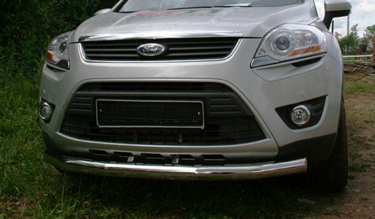 Защита переднего бампера труба предназначена для автомобилей Ford Kuga от 2008 г.в. Вам не придется подгонять защиту под размеры бампера вашего авто. И с монтажом проблем не возникнет: установка защиты переднего бампера производится в штатные отверстия, а значит, необходимость сверлить кузов отпадает.