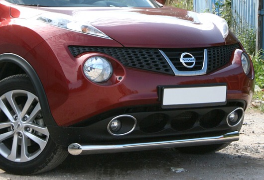 Труба на бампер Nissan Juke защищает передний бампер автомобиля от различных механических повреждений при мелких ДТП и неудачных парковках, а также незаменима при езде по бездорожью. А кроме этого, труба на передний бампер Ниссан Жук смотрится очень стильно и эффектно.