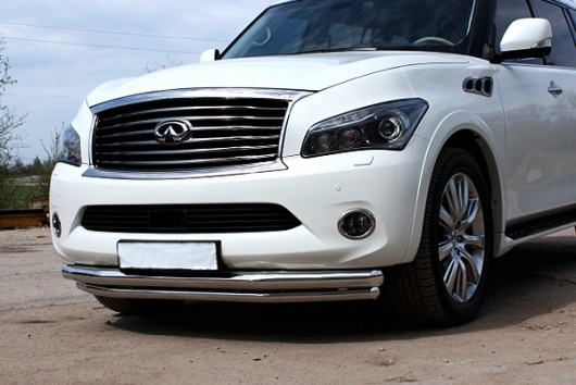 Защита переднего бампера для Infiniti QX56 – это двойная труба на бампер из нержавеющей стали диаметром 76/60 мм.