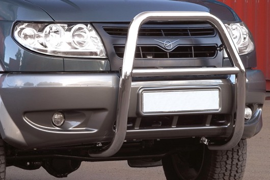 Передняя решетка UAZ Patriot (кенгурятник) – это защитная дуга на бампер из нержавеющей стали диаметром 60 мм.