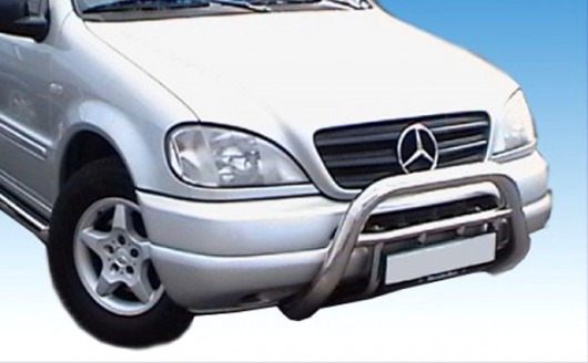 Защитная решетка переднего бампера предназначена для автомобилей Mercedes Benz M-Class 1997-2001 г.в. Вам не придется подгонять передний кенгурятник под размеры кузова вашего авто. И с монтажом проблем не возникнет: установка кенгурятника Mercedes M-Class производится в штатные отверстия, а значит, необходимость сверлить кузов отпадает.