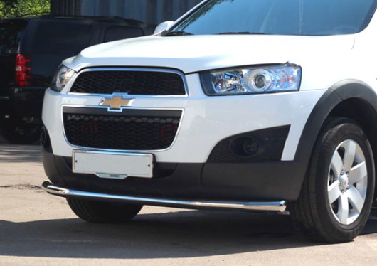 Защита переднего бампера труба предназначена для автомобилей Chevrolet Captiva от 2012 г.в. Вам не придется подгонять защиту под размеры бампера вашего авто. И с монтажом проблем не возникнет: установка защиты переднего бампера производится в штатные отверстия, а значит, необходимость сверлить кузов отпадает.