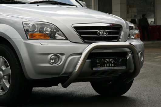 Передняя решетка Kia Sorento (кенгурятник) – это защитная дуга на бампер из нержавеющей стали диаметром 76 мм.