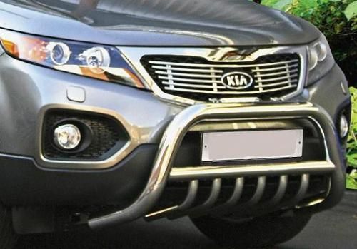 Защитная решетка переднего бампера предназначена для автомобилей Kia Sorento 2009-2012 г.в. Вам не придется подгонять передний кенгурятник под размеры кузова вашего авто. И с монтажом проблем не возникнет: установка кенгурятника Kia Sorento производится в штатные отверстия, а значит, необходимость сверлить кузов отпадает.