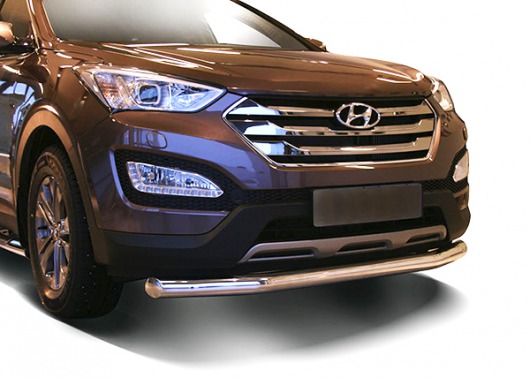 Защита переднего бампера труба предназначена для автомобилей Hyundai Santa Fe от 2013 г.в. Вам не придется подгонять защиту под размеры бампера вашего авто. И с монтажом проблем не возникнет: установка защиты переднего бампера производится в штатные отверстия, а значит, необходимость сверлить кузов отпадает.