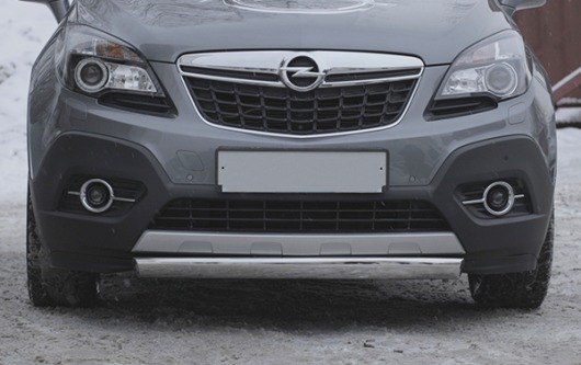 Защита переднего бампера труба предназначена для автомобилей Opel Mokka от 2012 г.в. Вам не придется подгонять защиту под размеры бампера вашего авто. И с монтажом проблем не возникнет: установка защиты переднего бампера производится в штатные отверстия, а значит, необходимость сверлить кузов отпадает.