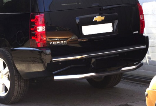 Труба на задний бампер Chevrolet Tahoe защищает задний бампер автомобиля от различных механических повреждений при столкновениях на дороге и неудачных парковках. А кроме этого, ступень на задний бампер для Шевроле Тахо — это еще и деталь тюнинга, а также дополнительная подножка для авто. Красиво и практично.