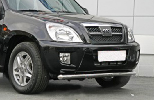 Защита переднего бампера труба предназначена для автомобилей Cherry Tiggo от 2005 г.в. Вам не придется подгонять защиту под размеры бампера вашего авто. И с монтажом проблем не возникнет: установка защиты переднего бампера производится в штатные отверстия, а значит, необходимость сверлить кузов отпадает.