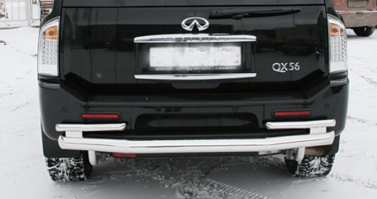 Защита заднего бампера для Infiniti QX 56 – это двойная труба на бампер из нержавеющей стали диаметром 76/60 мм.