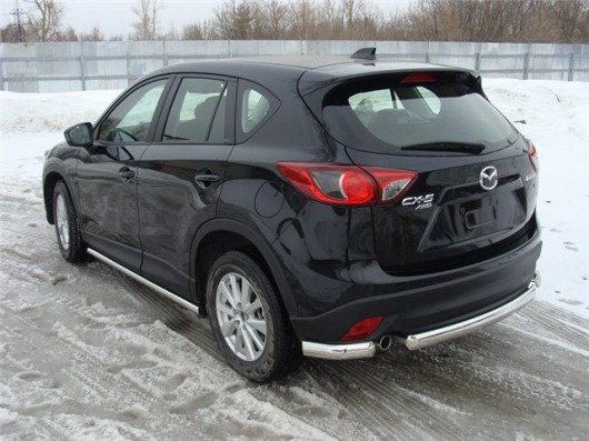 Защита заднего бампера труба предназначена для автомобилей Mazda CX-5 от 2012 г.в. Вам не придется подгонять защиту под размеры бампера вашего авто. И с монтажом проблем не возникнет: установка защиты заднего бампера производится в штатные отверстия, а значит, необходимость сверлить кузов отпадает.