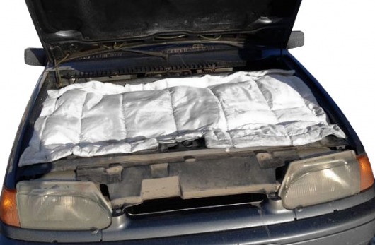 Автоодеяло весит всего несколько килограммов и устанавливается легко и просто. Правильно подобранное, оно стелится любой стороной на мотор, ничем не закрепляется и полностью закрывает моторный отсек. При необходимости вы сможете подвернуть края утеплителя. Материал имеет высокую плотность, так что вы можете быть уверены в том, что одеяло не намотается на подвижные части двигателя.