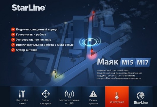 GPS/GSM-маяк Starline M17 имеет встроенную GPS-антенну и технологию А-GPS. Они мгновенно определяют точные координаты нахождения устройства в любых, даже самых тяжелых, условиях. При всем этом маяк практически нельзя выследить с помощью подручных устройств угонщиков - сканеров GSM-сигналов. Это объясняется тем, что маяк М15 работает импульсами, а сигналы настолько короткие, что их сложно обнаружить.