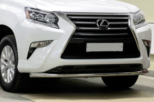 Защита переднего бампера труба предназначена для автомобилей Lexus GX460 от 2013 г.в. Вам не придется подгонять защиту под размеры бампера вашего авто. И с монтажом проблем не возникнет: установка защиты переднего бампера производится в штатные отверстия, а значит, необходимость сверлить кузов отпадает.