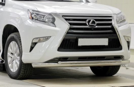 Двойная труба на бампер Lexus GX460 защищает передний бампер автомобиля от различных механических повреждений при мелких ДТП и неудачных парковках, а также незаменима при езде по бездорожью. А кроме этого, труба на передний бампер Лексус GX460 смотрится очень стильно и эффектно.