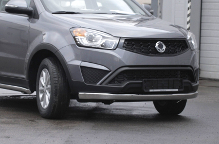 Защита переднего бампера труба предназначена для автомобилей SsangYong Actyon от 2013 г.в. Вам не придется подгонять защиту под размеры бампера вашего авто. И с монтажом проблем не возникнет: установка защиты переднего бампера производится в штатные отверстия, а значит, необходимость сверлить кузов отпадает.