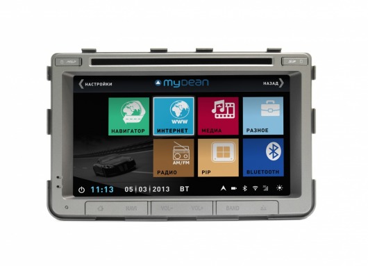 Штатная голова сделана на базе двухъядерного процессора частотой 1 Ггц семейства ARM Cortex с очень высокой производительностью. На ШГУ MyDean 3269 устанавливается операционная система WinCE 6.0 с полностью русифицированным меню. Сенсорный дисплей диагональю 7", с разрешением 800х480 и высокой контрастностью позволяет отлично просматривать фото и видео всех основных форматов, включая видео высокой чёткости HD. Также Вы можете просматривать эфирное телевидение, для этого в штатную голову встроен аналоговый ТВ-тюнер.