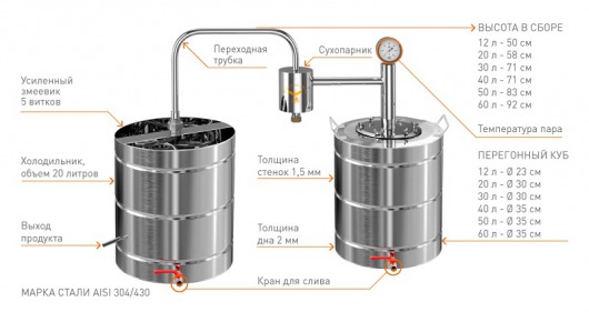 С помощью этого самогонного аппарата средней вместимости с сухопарником и баком на 40 литров вы легко сможете приготовить качественные спиртные напитки в любых условиях, например, на даче или в деревне. Этот аппарат не обязательно подключать к водопроводу: для охлаждения змеевика в нем предусмотрен дополнительный резервуар, который заполняется холодной водой. При этом вам не придется осваивать сложные технологии самогоноварения: достаточно просто залить в бак брагу и поставить аппарат на плиту (подойдет как газовая, так и электрическая плита) или на костер (почему бы и нет?).