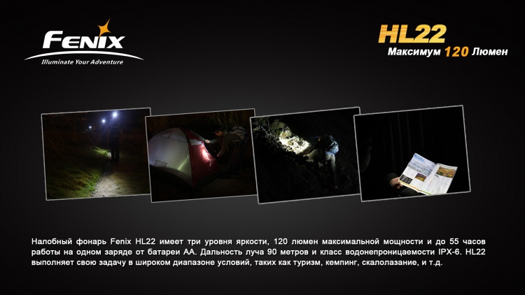 Мощный налобный фонарь FenixHL22 оснащается качественным диодом Creeсо сроком службы до 50 000 часов. Качественный источник свкета и высококлассная оптика позволяет достичь максимальной яркости в 120 люмен и световой луч длиной до 90 метров. Всего же у яркого налобного фонаря 3 основных режима яркости: