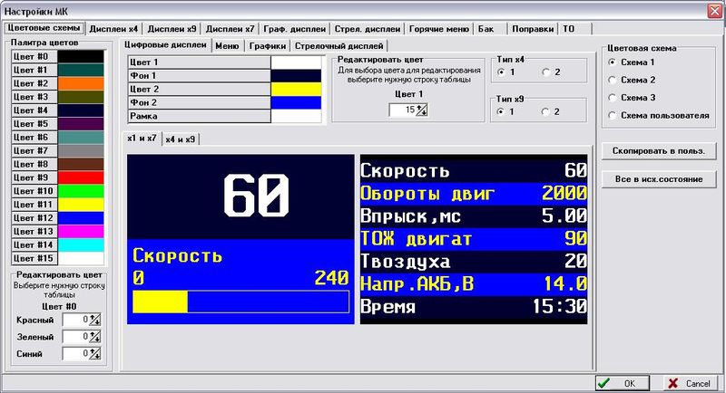 Цветной TFT дисплей 2.4" разрешением 320х240 и рабочей температурой от -20 градусов. Цветовое оформление дисплеев может быть настроено пользователем индивидуально (по RGB каналам). Четыре предустановленные цветовые схемы с быстрым переключением.