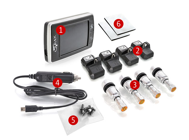 В каждое колесо устанавливается (крепится к клапану) блок датчиков контроля состояния колеса с встроенным передатчиком и элементом питания. Блоки очень легкие, что позволяет вам без проблем производить балансировку колес после сборки. Питание происходит от простого прикуривателя. Больше никаких специальных настроек или подключений не требуется.