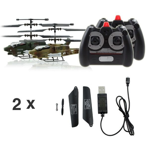 Радиоуправляемые вертолеты JXD 353 для воздушных боев — это комплект из 2-х вертолетов, у которых, по сравнению с предыдущими моделями, более укрепленный корпус, улучшенный пластик, лёгкий вес и увеличенное время работы. В каждом вертолете есть инфракрасный приёмник, гироскоп и пушка для имитации стрельбы ракетами. Время полета составляет, примерно, 10 минут, а радиус действия пульта управления - 10-15 метров. Вертолет на пульте устойчив в полете, и летает во всех направлениях, а также по кругу и восьмёркой.