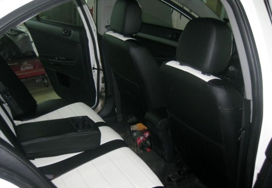 Вопросы и отзывы про Чехлы автомобильные для Mitsubishi Lancer X, хэтчбек, 2 л., от 07 г.в. (черно-белые, экокожа)