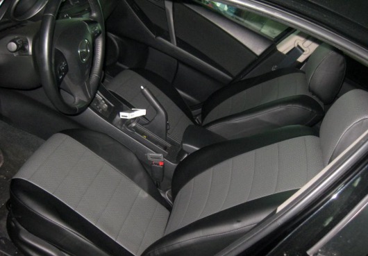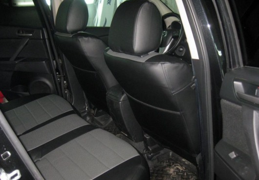 Вопросы и отзывы про Чехлы автомобильные для Mazda 3, седан/хэтчбек 09-13 г.в. (черно-темно-серые, экокожа)