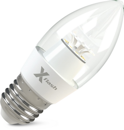Светодиодная лампа X-Flash Candle E27 отлично подходит для общего и декоративного освещения. Колба лампы прозрачная, выполнена в виде пламени свечи. Лампа соответствует по форме, цоколю и размерам аналогичным компактным люминесцентным лампам и лампам накаливания. Может применяться в любых светильниках с цоколем типа «миньон». Данная модель рассчитана на напряжение 220 В. Мощность диодной лампы X-Flash — 6,5 Вт., яркость —520Лм, угол освещения лампы более 270 градусов, а температура свечения – 4000 K (это белый свет).