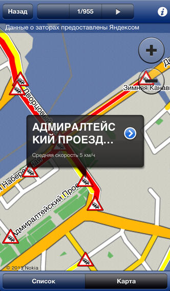 Автомобильный навигатор Garmin 2597LMT использует сервис Яндекс.Пробки как основной источник информации о трафике. Уровень загруженности отображается на экране в баллах.