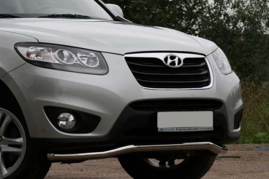 Защита переднего бампера труба предназначена для автомобилей Hyundai Grand Santa Fe от 2014 г.в. Вам не придется подгонять защиту под размеры бампера вашего авто. И с монтажом проблем не возникнет: установка защиты переднего бампера производится в штатные отверстия, а значит, необходимость сверлить кузов отпадает.