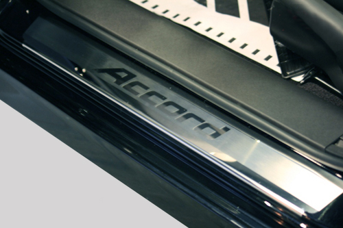Внутренняя накладка на порог Honda Accord — это аксессуар автомобильного тюнинга, который защищает внутренний порог от механических повреждений при посадке и высадке из машины. Декоративные накладки с рисунком на внутренние пороги предназначены для автомобилей Honda Accord от 2008 г.в.