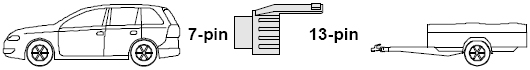 Адаптер-переходник с 7 контактов на 13 контактов. Обеспечивает связь между фаркопом с 7-контактной розеткой и прицепом с 13-контактным штеккером (разъемом).