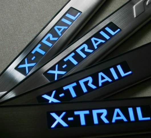 Светящиеся накладки на пороги Nissan X-Trail не входят ни в одну комплектацию этой модели автомобиля. Они позволят вам сделать свой автомобиль еще более оригинальным и стильным. Каждое открытие двери будет сопровождаться теплым синим светом. Накладки на пороги с подсветкой оснащены дополнительными полосами для плотного соприкосновения ноги с порогом.