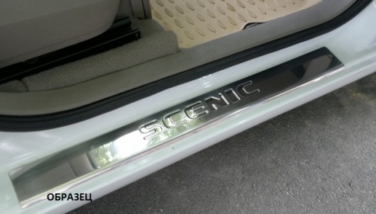 Внутренняя накладка на порог Renault Scenic — это аксессуар автомобильного тюнинга, который защищает внутренний порог от механических повреждений при посадке и высадке из машины. Декоративные накладки с рисунком на внутренние пороги предназначены для автомобилей Renault Scenic от 2003 г.в.