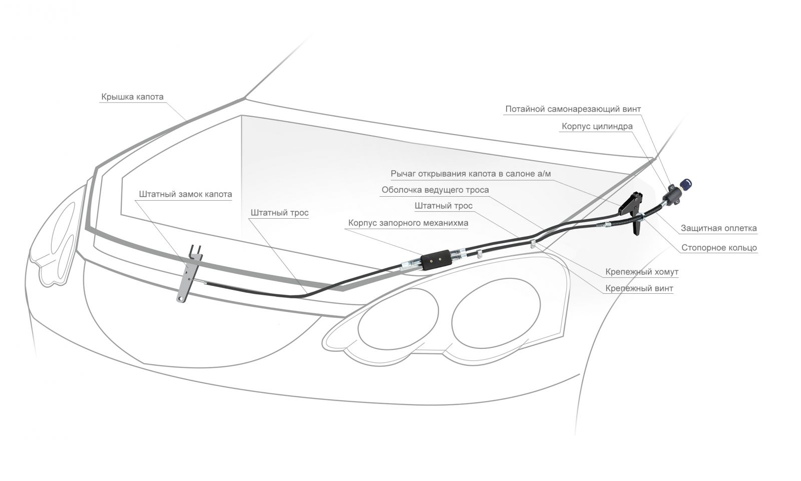 Механический замок капота Fortus Hood Lock "в разрыв" защищает ваш автомобиль от угона. Противоугонное устройство - эта система блокировки, которая управляет запорным механизмом с помощью специального троса с гибким корпусом.