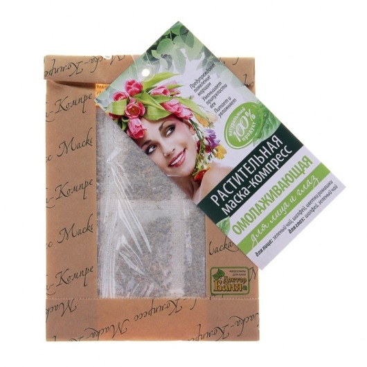 Растительная маска-компресс для лица и глаз полностью покрывает лицо. Для дыхания предусмотрена специальная прорезь. Состав: для лица – зелёный чай, шалфей, цветки ромашки; для глаз – шалфей, зелёный чай. Отборные травы высшего качества, экологически чистый и натуральный продукт.