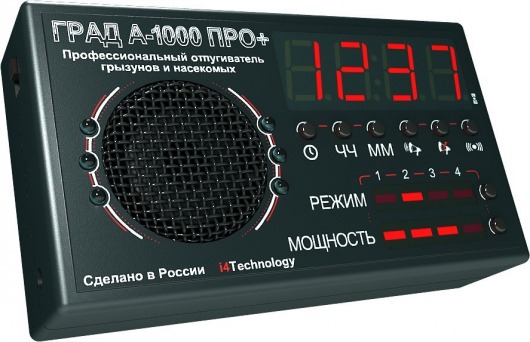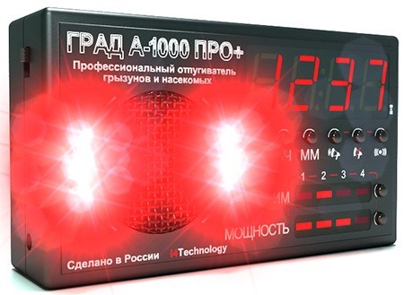 Универсальный отпугиватель грызунов и кротов ГРАД А-1000 ПРО+ — это усовершенствованная модель А-1000 ПРО и не имеет аналогов в мире! Помимо всех выполняемых функций, сохранившихся от А-1000 ПРО, устройство оснащено часами и таймером для работы прибора в автоматическом режиме. Данная модель способна защитить огромную площадь — до 1000 м2 от любых вредителей, поддерживает бесшумный режим и регулировку мощности излучения. Воздействие на грызунов происходит 3-мя способами: звук, вспышки светодиодного стробоскопа и ультразвук. Особый изменяющийся "рисунок" звукового сигнала не дает грызунам адаптироваться к работе устройства.