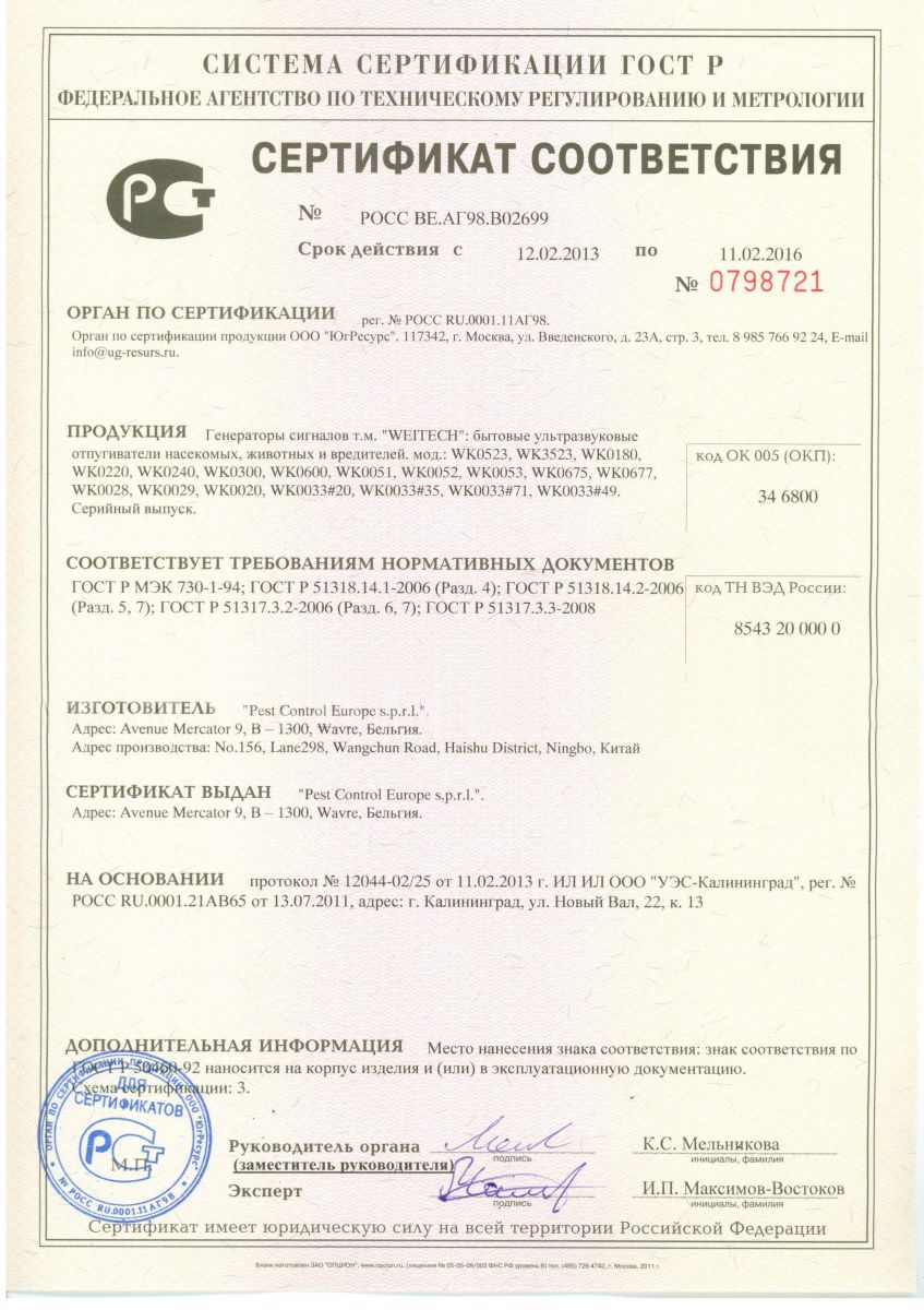 Отпугиватель соответствует требованиям Таможенного союза и прошел сертификацию